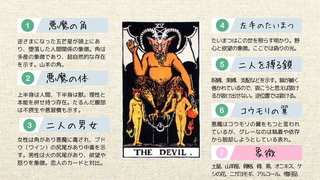 今日はタロットカード15番目のカード「悪魔」のカードの解説をしていきます。